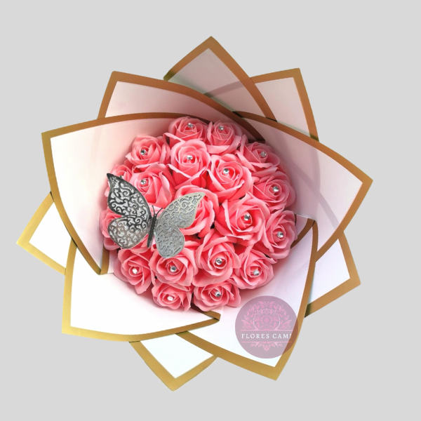 Lindo ramo con 20 rosas eternas rosadas decoradas en el centro mas linda mariposa para decoración con fina envoltura de papel coreano y lazo con cinta de tela