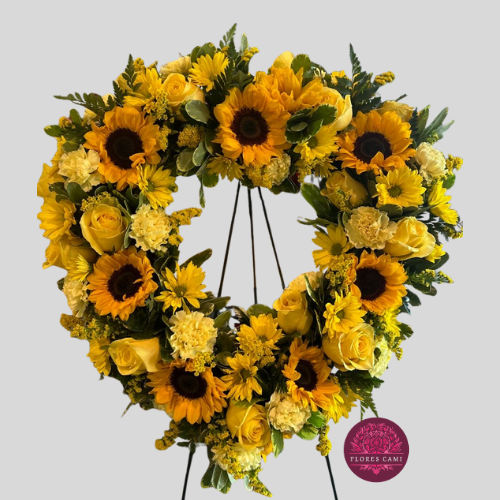 Linda Corona en forma de corazón fúnebre en rosas importadas y girasoles de importación y astromelias mas follaje, medidas (80cm) incluye atril.