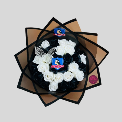 Exclusivo ramo de 30 rosas blancas y negras eternas de jabón con temática de el equipo de futbol Colo-Colo , con fina envoltura de papel coreano y tiernas mariposas para decoracion.