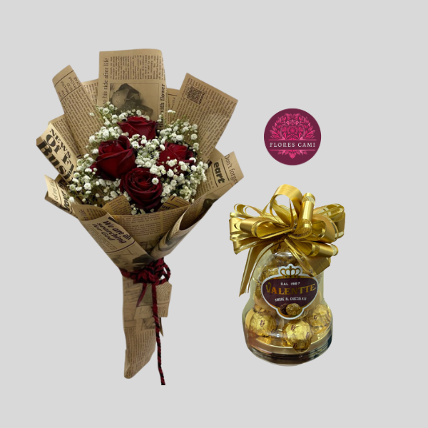 Lindo Ramo Con 4 Rosas Importadas mas Ilusión y Verde, Envuelto En Elegante Papel Kraft (Diseño de papel Opcional) y lindo lazo con cinta organza todo con deliciosa campana de 12 bombones Valentte de 150g