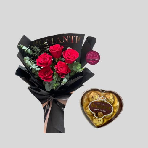 Hermoso ramo de 5 rosas con eucalipto y verde de temporada envuelto en elegante papel mas lazo con cinta de tela y bombones Valentte con forma de corazón de 5 unidades.