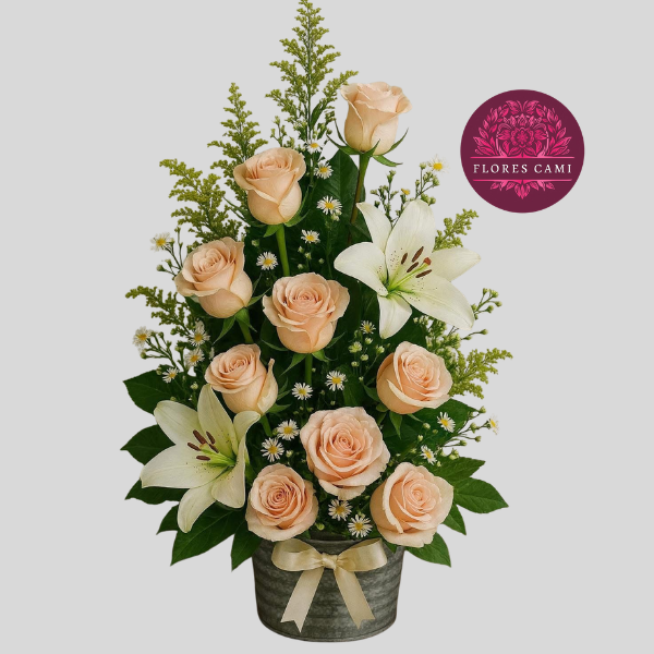 Fino arreglo con 10 Rosas color damasco, dos lirios blancos , follaje y verde de temporada, todo con lindo lazo de cinta satinada.