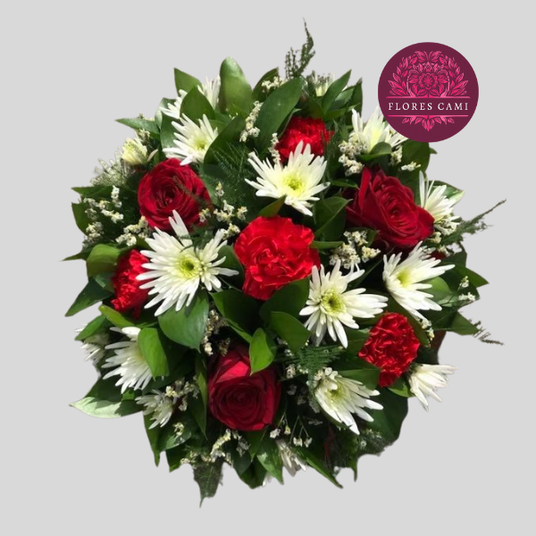 Lindo arreglo con 3 rosas rojas, maule blanco y follaje rojo mas verde de temporada, todo en rustica base de madera.