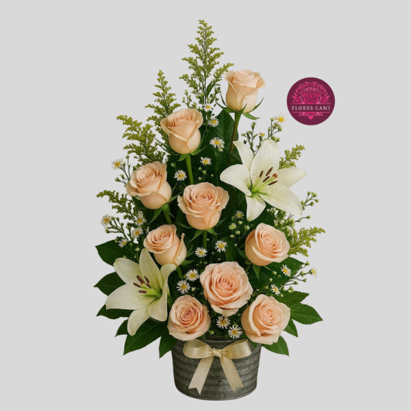 Lindo arreglo en 10 rosas importadas rosadas mas lirios, ilusión y verde de temporada , todo con lindo lazo de cinta de tela y base de cerámica.