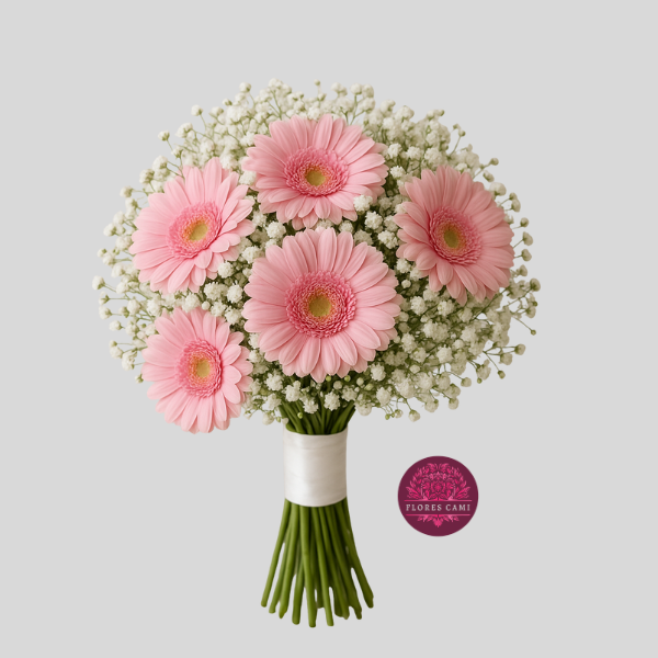 Lindo ramo de novia redondo con  gerberas en combinación de gipsófila y tallos envuelto en cinta de tela .