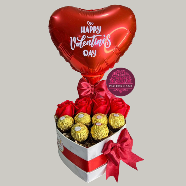 Lindo box de corazón con 4 rosas eternas de jabón y 6 deliciosos bombones mas globito corazón personalizado (Frase corta elegida por remitente) mas lazo con cinta satinada.