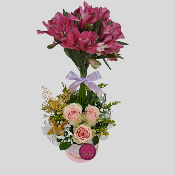 Hermoso box en combinación de astromelias 3 rosas acompañado de bella mariposa y lazo en cinta de organza.