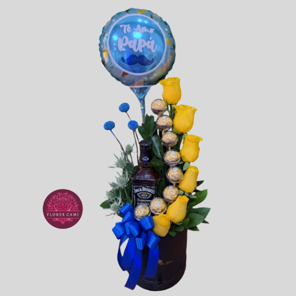 Jack Daniel’s de 375 ml acompañado en bello follaje y globito mas lazo en cinta de organza ..