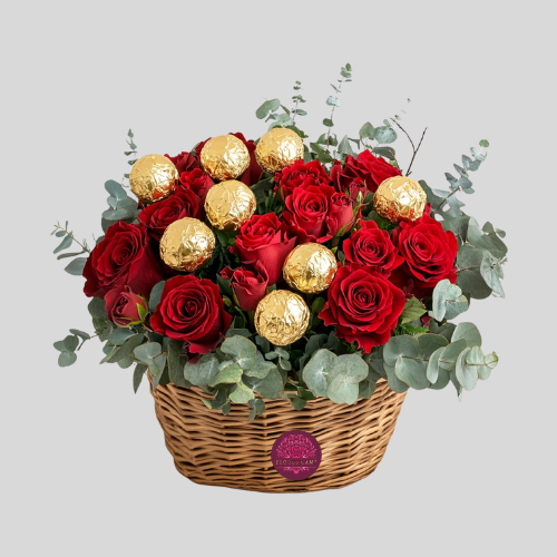 Linda canasta de mimbre con 12 rosas rojas importadas , eucalipto y 10 deliciosos bombones , todo con lindo rosetón de cinta de tela.