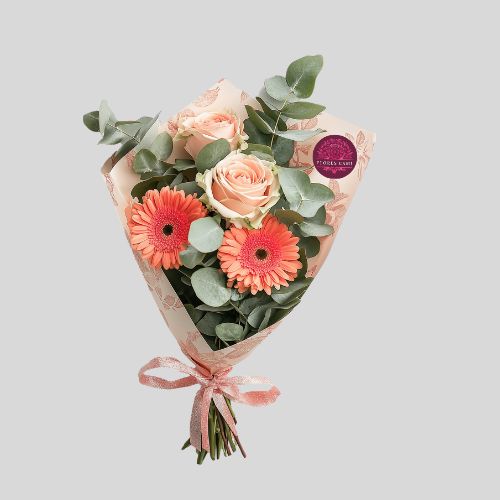 Elegante ramo con 2 rosas rosadas importadas , dos gerberas rosadas y eucalipto , todo en fina envoltura de papel coreano y lazo con cinta de tela