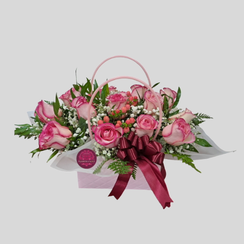 Hermosa cartera con 12 rosas rosadas mas lindo follaje y lazo en cinta de tela .