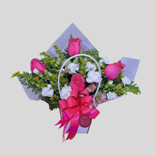 Bella carterita blanca en 4 rosas fucsias en combinación de soldado, mini claveles y lazo en cinta de organza.