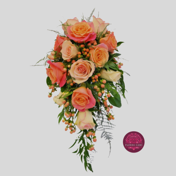 Elegante Ramo de novia en cascada con rosas color anaranjadas mas hipérico y lindo follaje verde, todo en base con mango para el agarre del ramo.