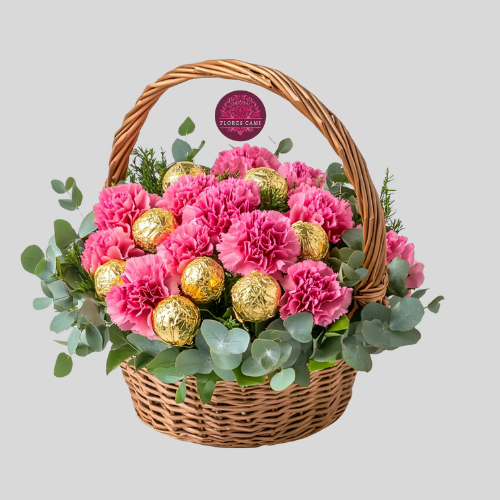 Linda canasta de mimbre con claveles rosados, eucalipto y 10 deliciosos bombones , todo con lindo lazo de cinta satinada.