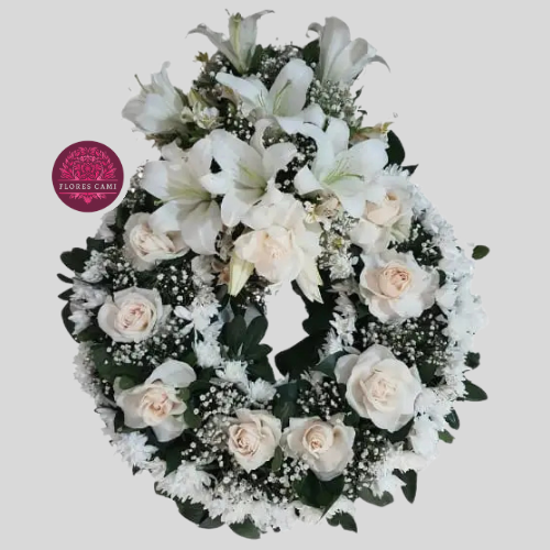 Elegante corona clásica en 8 rosas importadas, liliums, maules mas ilusión y follaje verde . MEDIDAS 60 CM