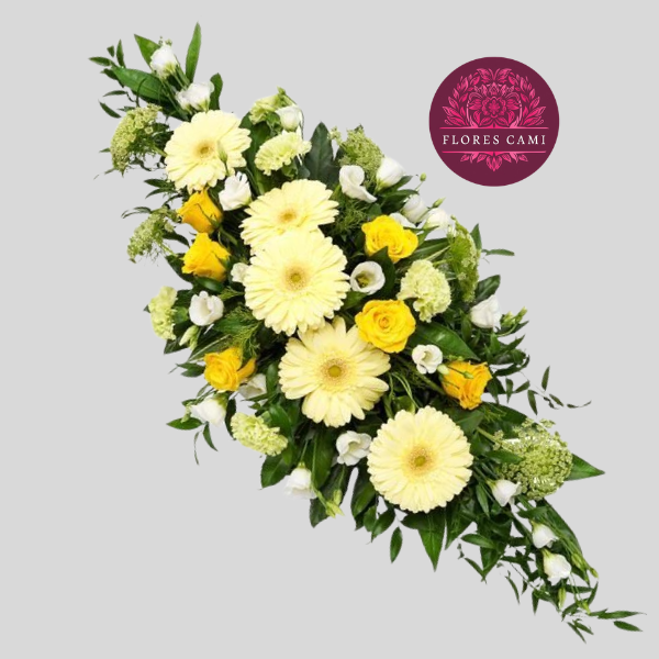 Fino cubre urnas con 5 gerberas amarillas, verde , follaje de temporada y 6 rosas amarillas .