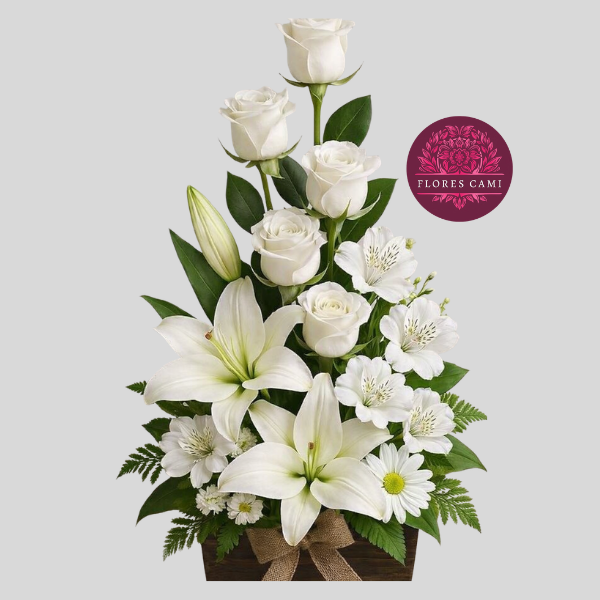 Fino arrimo en base de madera con 5 rosas blancas importadas, astromelias blancas, lirio blanco y follaje de temporada , todo con lindo lazo de cinta satinada.