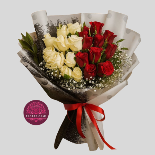 Hermoso diseño en ramo con 20 rosas , mitad 10 rojas y mitad 10 blancas con fina envoltura en papel coreano y lazo con cinta satinada.
