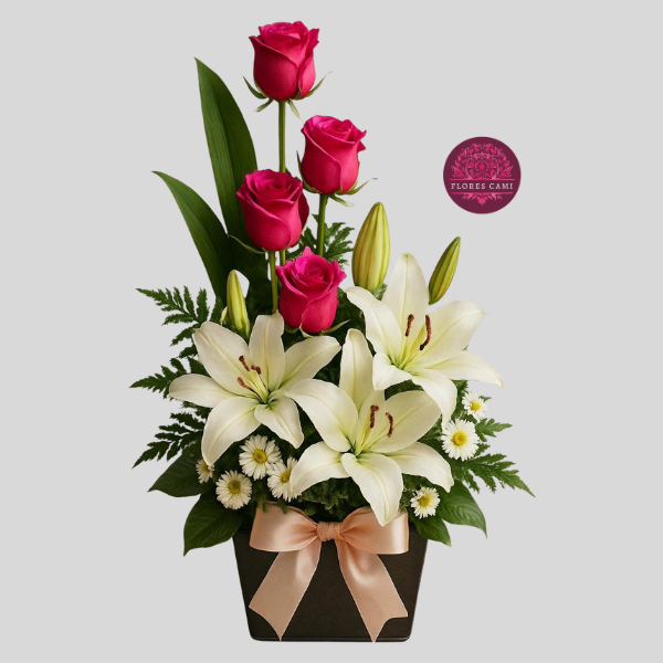 Lindo Box Cuadrado con 4 rosas fucsias en escala mas lirios blancos, ilusión y verde de temporada, todo con tierno lazo de cinta de tela.