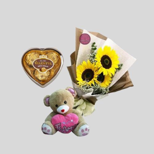 Ramo en 3 girasoles mas follaje envuelto en papel y lazo en rafia mas peluche de 20 cm y bombones valentte de 3 unidades.