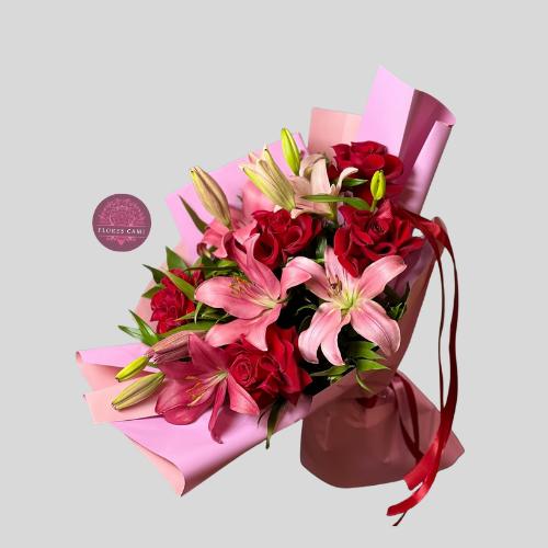 Fino ramo extendido horizontal con 12 rosas rojas importadas y liliums rosados mas verde de temporada, todo en hermosa envoltura de papel coreano y lazo con cinta de tela.