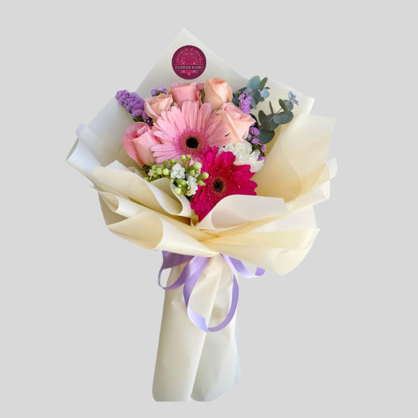 Delicado ramo con 5 rosas rosadas mas dos hermosas gerberas, eucalipto y follaje de temporada, todo en elegante envoltura de papel coreano y lazo con cinta de tela