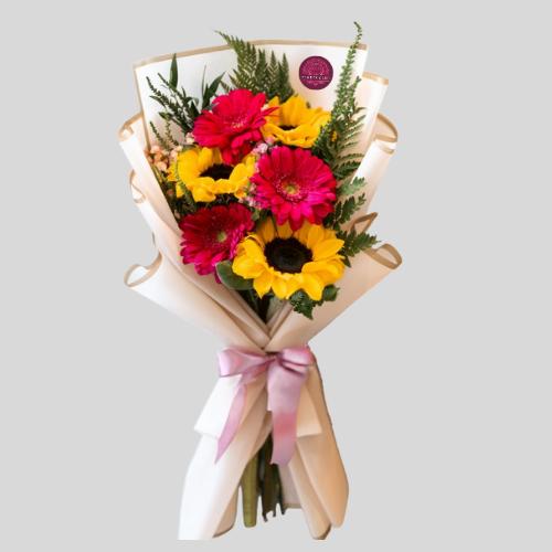Lindo ramo de 3 girasoles y 3 gerberas fucsias mas verde de temporada, todo envuelto en fino papel coreano mas lazo con cinta de tela.