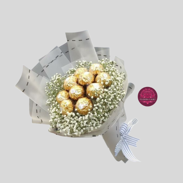 Lindo ramo de 10 deliciosos bombones y gipsofilia todo envuelto en fino papel coreano y lazo con cinta de tela.