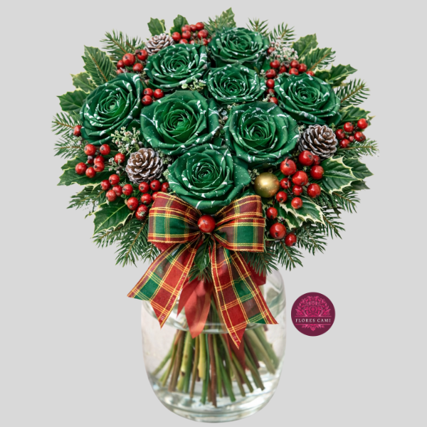 Lindo florero con 10 rosas con diseño navideño mas follaje de temporada y decoraciones navideñas con lindo rosetón de cinta satinada.