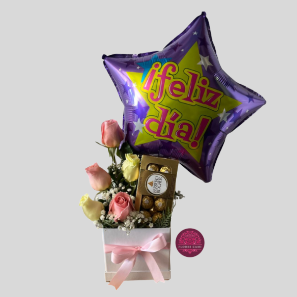 Lindo box con 5 rosas bicolor mas globo grande (Temática elegida por remitente) , bombones Ferrero Rocher de 100g y lazo con cinta de tela