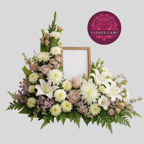 Exclusivo arreglo floral de condolencias que lleva Rosas, cremones, maule, lirios, verde de temporada , entre otras flores en tonos pasteles, también incluye un porta retrato al cual se le colocara la foto que nos envíe el remitente (la foto sera en blanco y negro).