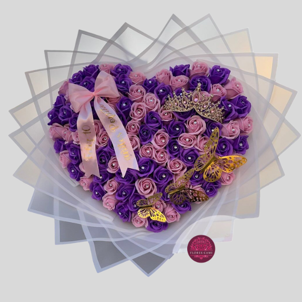 Hermoso ramo de 100 Rosas eternas de jabón bicolor con hermosa diadema, mariposas para decoración y lazo con cinta satinada, todo con fina envoltura de papel coreano y lazo con cinta de tela.