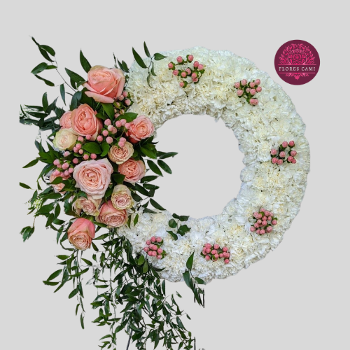Hermosa corona de Maule con rosas , ilusión y verde de temporada(Medidas 70 cm).
