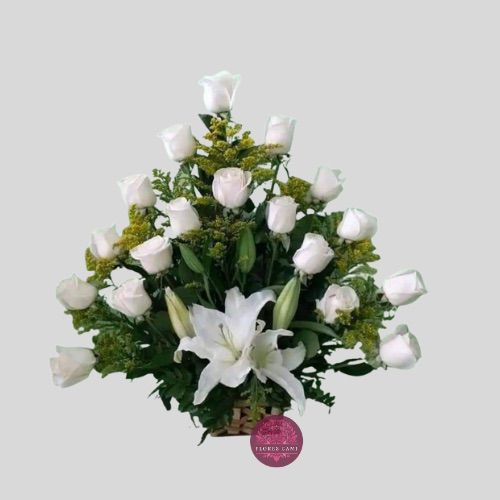 Elegante arrimo en base de madera con 18 rosas blancas importadas mas lindos liliums , ilusion y verde de temporada , todo con lindo lazo de cinta de tela. (medidas 60-70cm)