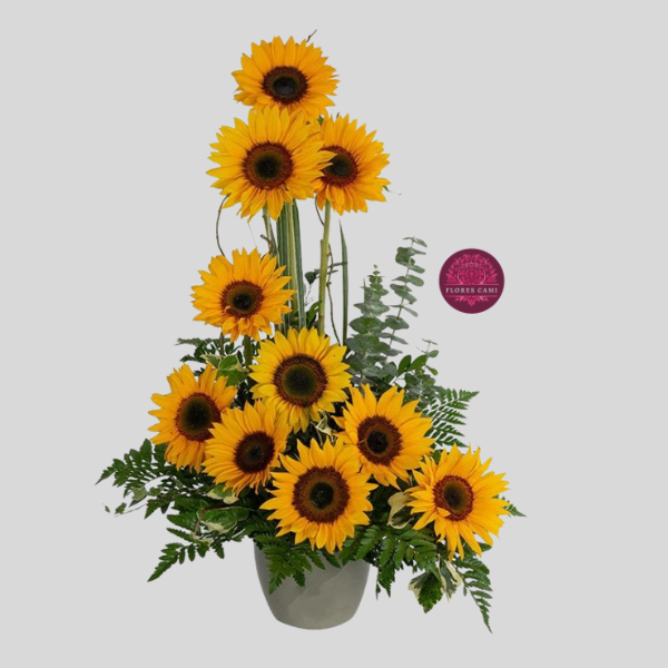 Bello diseño de 10 girasoles en box mas lindo follaje.