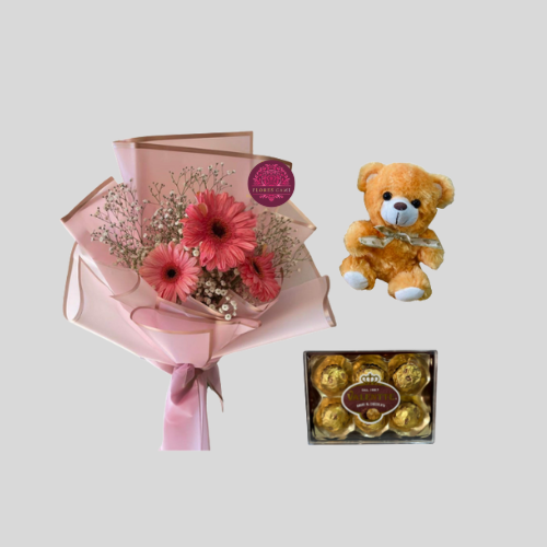 Hermoso Ramo con 3 gerberas y ilusión envuelto en lindo papel con lazo de cinta mas peluche de 20 cm y bombones Valentte de 6 unidades de 75g.