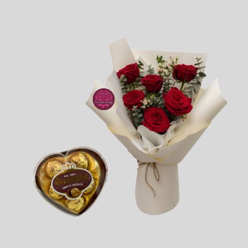 Elegante ramo de 6 rosas con eucalipto y verde de temporada, envuelto en lindo papel mas lazo con cinta de organza y bombones Valentte de 62g 5 unidades.
