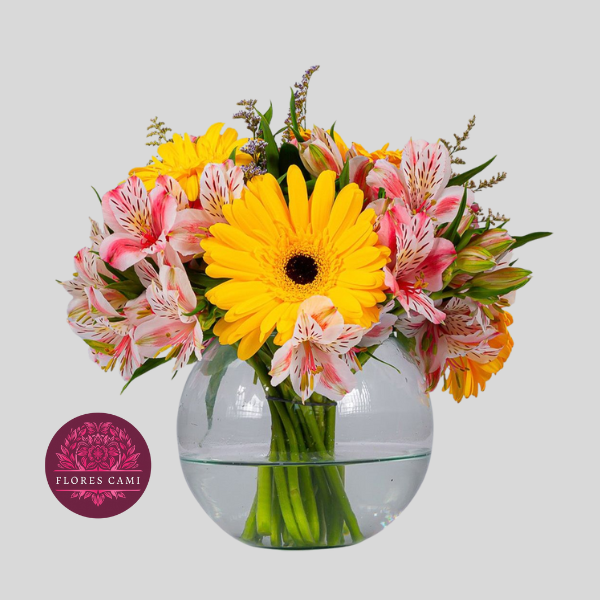 Linda pecera con 3 gerberas amarillas , astromelias blancas y verde de temporada.