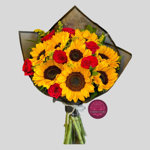 Fino ramo con 10 girasoles y 7 rosas rojas importadas mas verde, todo en extendida envoltura de papel coreano mas lazo con cinta satinada.
