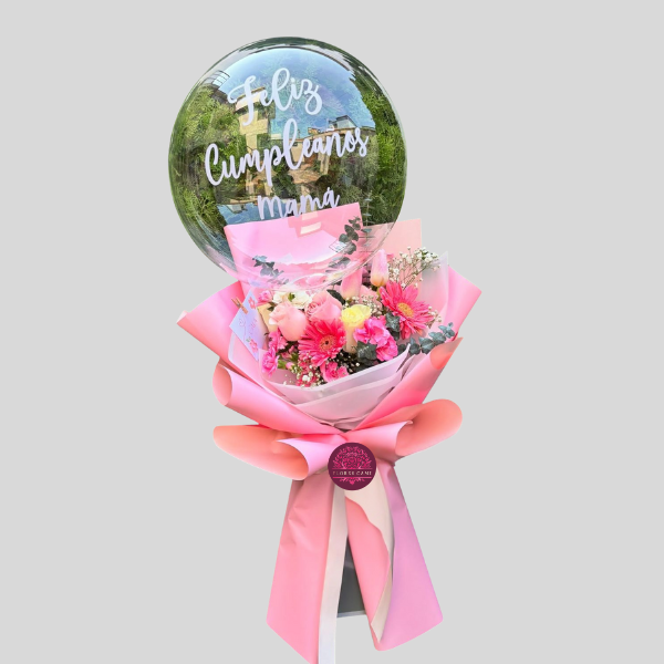 Lindo ramo con 10 rosas bicolor, gerberas , ilusión y eucalipto, envuelto en fino papel coreano con lazo de cinta de tela, mas lindo globo burbuja con frase personalizada.
