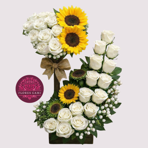 Exclusivo diseño con 15 rosas blancas en escalas con follaje y 3 girasoles más un diseño de corazón con 10 rosas blancas importadas y dos girasoles, todo en fina base de madera y lazo con rafia.