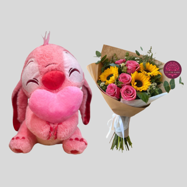 Lindo ramo Primaveral con 5 rosas importadas de color rosado , 3 girasoles, follaje de temporada y eucalipto, envuelto en papel Kraft mas lazo con cinta de tela color pastel y tierno peluche de Stitch Rosado con corazon en las manos de 50cm