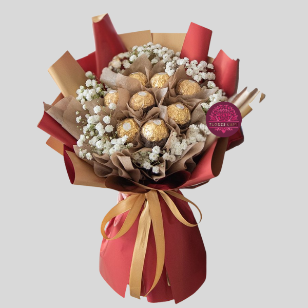 Lindo ramo con 10 deliciosos bombones, gipsofilia y con hermosa envoltura de papel coreano y lazo con cinta de tela.